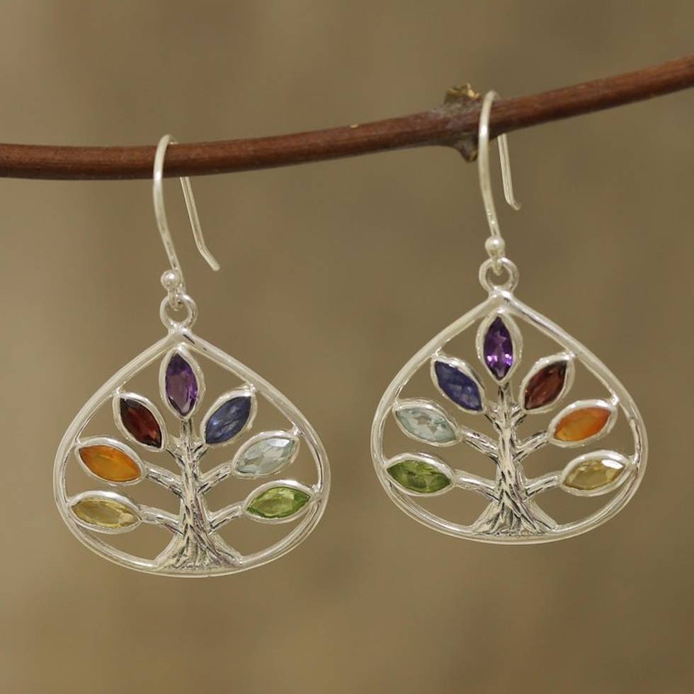Multi-Gemstone Chakra Tree Dangle Earrings from India 'Energy Tree' Item ID: 2669925281