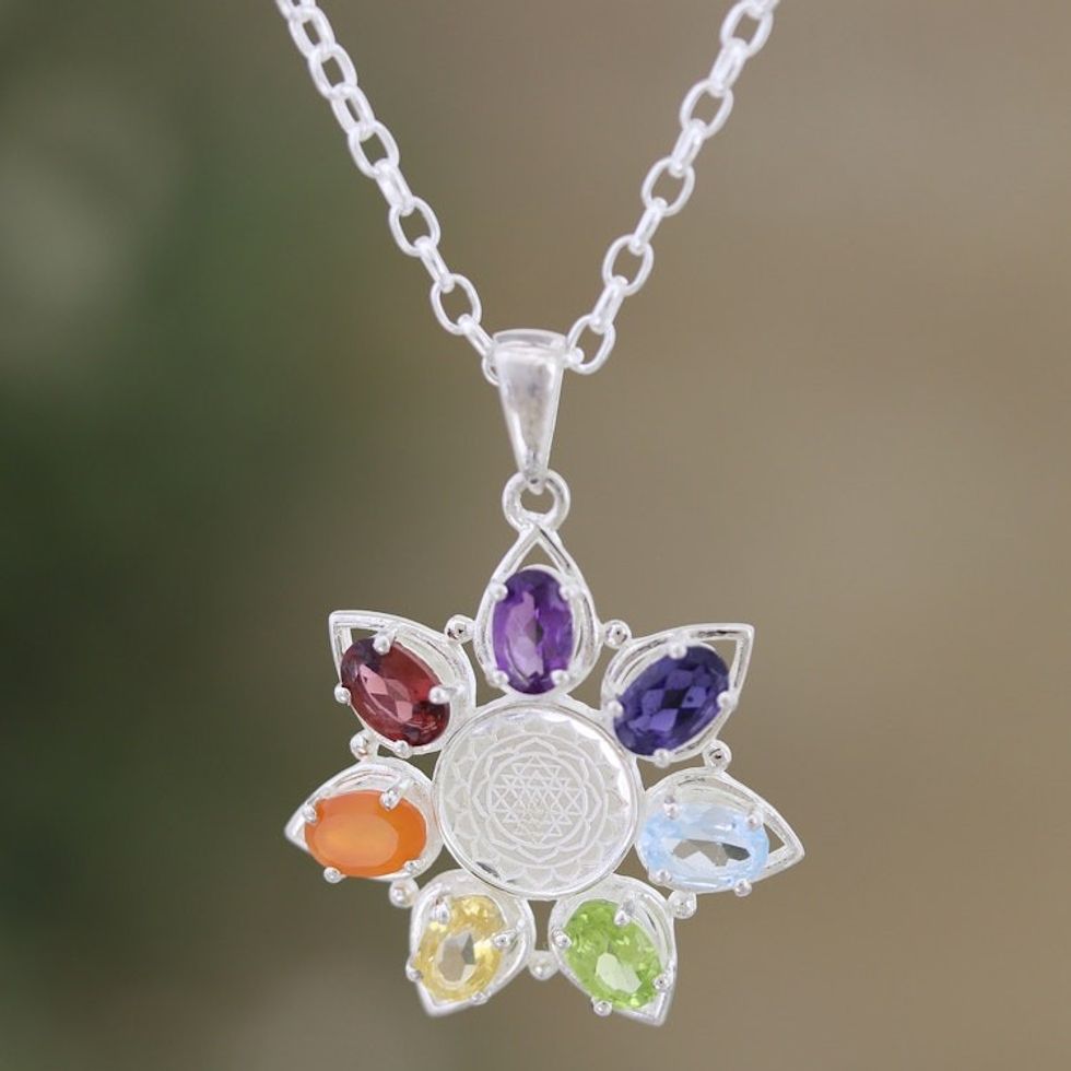 Multi-Gemstone Floral Pendant Necklace from India 'Enlightenment Flower' Item ID: 2671625850