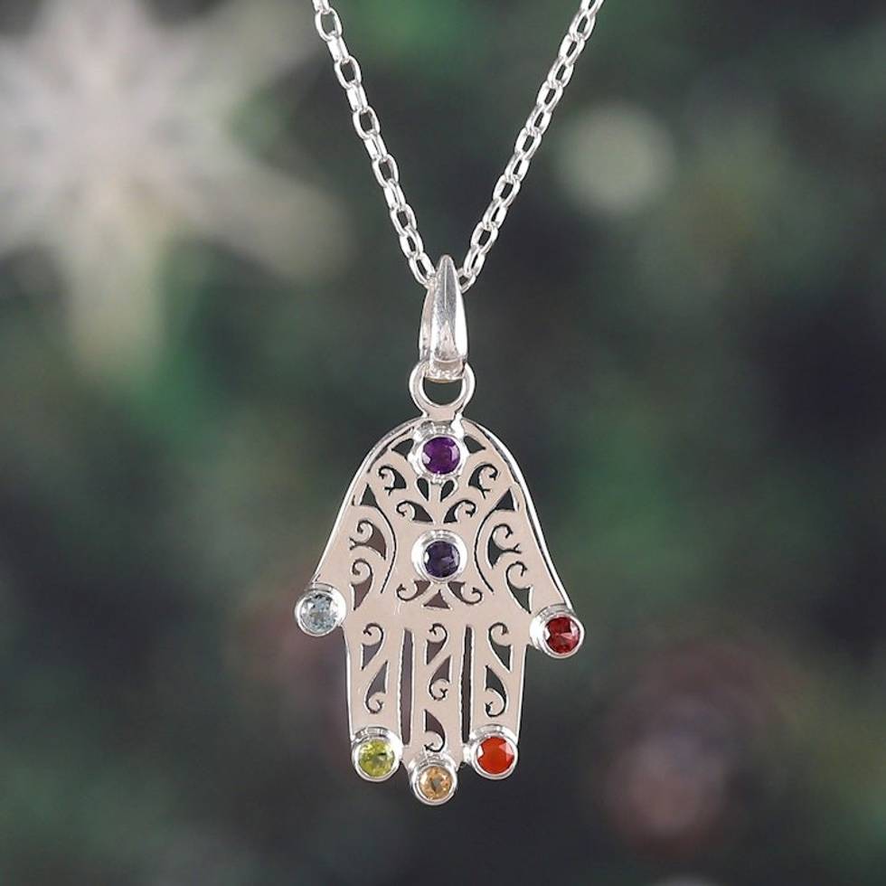 Multi-Gemstone Hamsa Chakra Pendant Necklace from India 'Hamsa Chakra' Item ID: 2671620244
