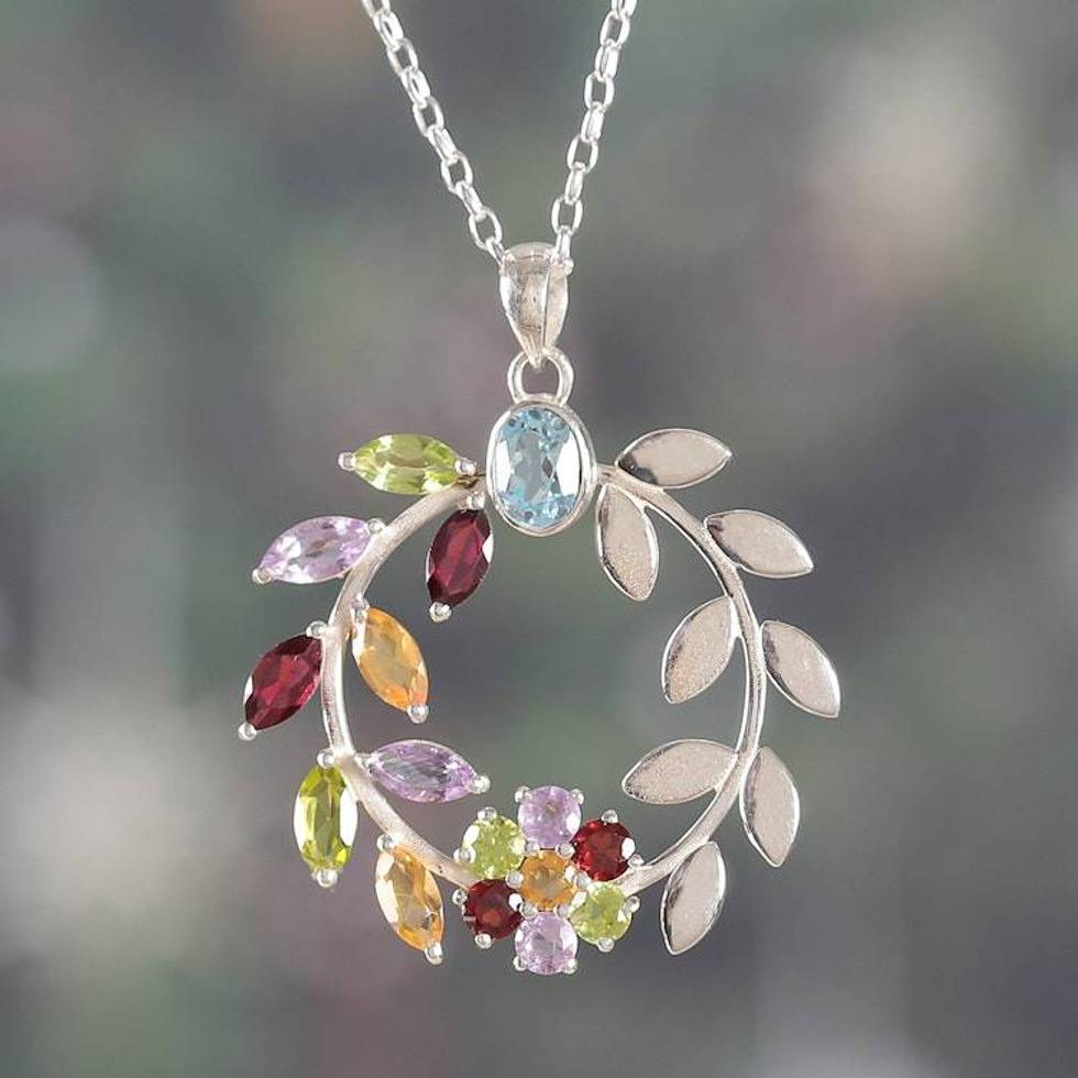 Multi-Gemstone Silver Necklace with Floral and Leaf Pendant 'Luxurious Garden' Item ID: 2676665255