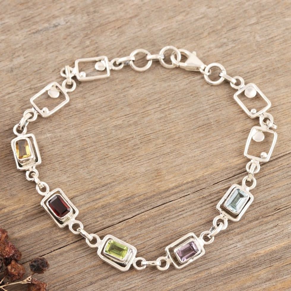 Multi-gemstone Sterling Silver Link Bracelet from India 'Colorful Consonance' Item ID: 2671786519