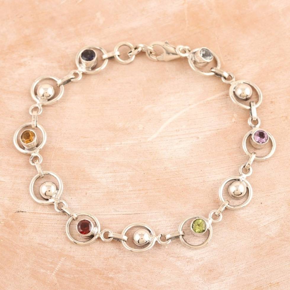 Multi-gemstone Sterling Silver Link Bracelet from India 'Colorful Orbs' Item ID: 2671786580