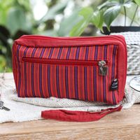 "A palette of red and purple hues brings a traditional lurik pattern to life, adding a vibrant accent to this cotton wristlet by the Lawe Lurik Community from Java. The artisans handweave the bag from cotton, adding a detachable strap and a zippered front pocket with a shiny iron charm. The interior also shows the design's high-quality craftsmanship: it comes with a cotton lining, multiple compartments, six card slots and two mesh pockets, all secured by a main zippered closure."