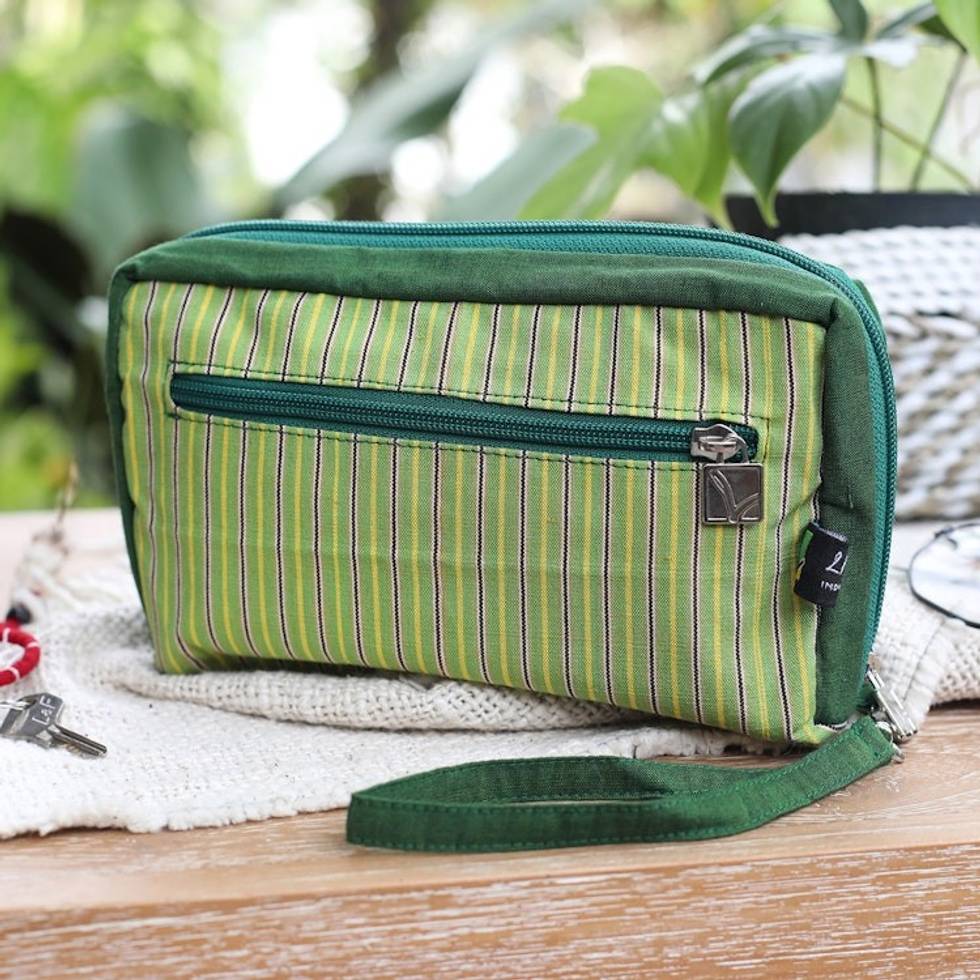 Multi-Pocket Striped Green Wristlet Bag Crafted from Cotton 'Versatile Green' Item ID: 2671763100