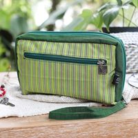 "A palette of green tones brings a traditional lurik pattern to life, adding a trendy accent to this cotton wristlet by the Lawe Lurik Community from Java. The artisans handweave the bag from cotton, adding a detachable strap and a zippered front pocket with a polished iron charm. The interior also shows the design's high-quality craftsmanship: it comes with a cotton lining, multiple compartments, six card slots and two mesh pockets, all secured by a main zippered closure."