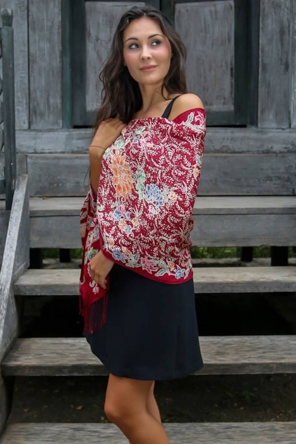 Multicolored Batik Flowers Hand Stamped on a Silk Shawl 'Blossoming Opulence' Item ID: 2671701772