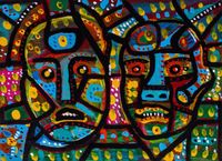 "Working with a bold color palette and a Cubist-inspired style, Dingi Guari of the Multiverse Group creates this fascinating original painting. The artist works in oils, acrylics and encaustic on canvas board to paint the composition, which depicts the artist's interpretation of pre-Hispanic deities."