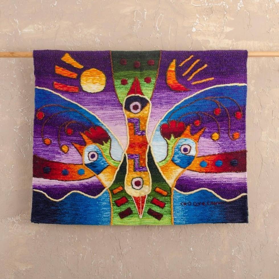"Influenced by Inca art and decorative motifs, Teofilo Choquecahua in Peru creates this stunning tapestry. The tapestry depicts a family of birds, each facing a different direction. The wall hanging is woven on a traditional pedal loom using pure alpaca yarns on a cotton warp."