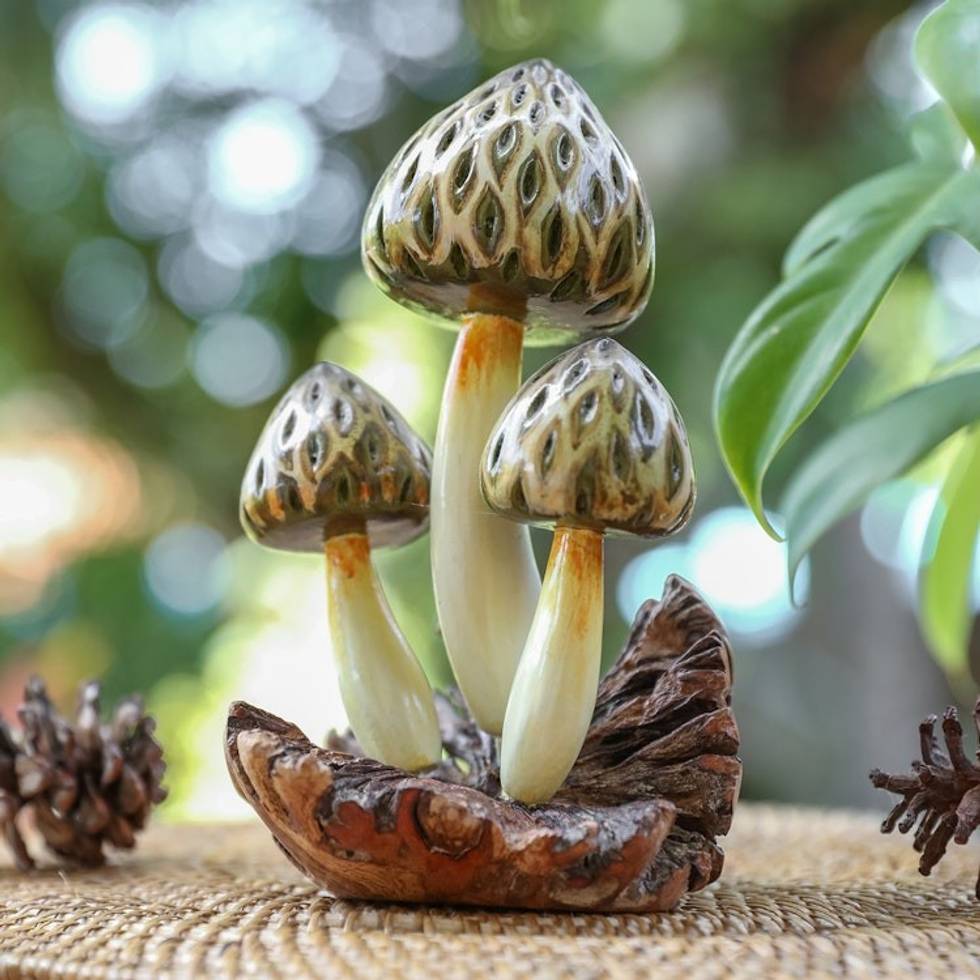 Mushroom-Themed Wood Sculpture Hand-Painted in Bali 'Morel Mushrooms' Item ID: 2671667946