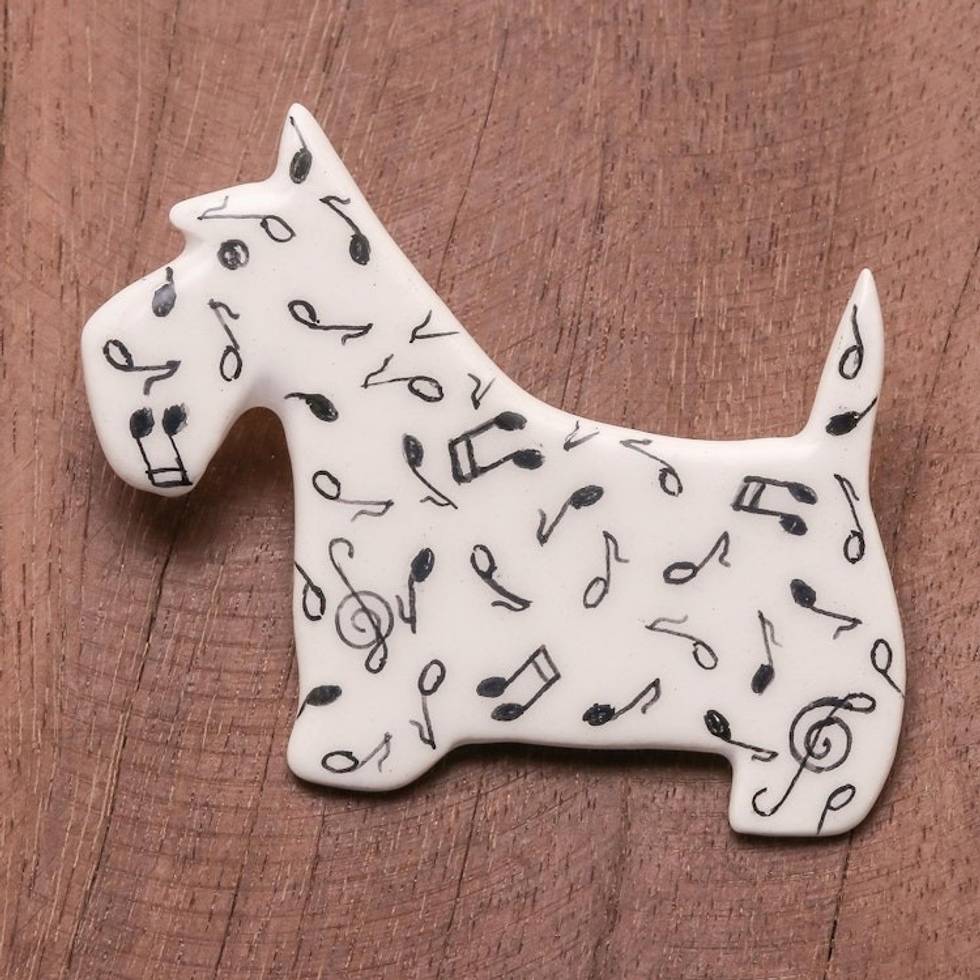 Music-Themed Ceramic Scottish Terrier Brooch from Thailand 'Scottish Terrier Melody' Item ID: 2671798830