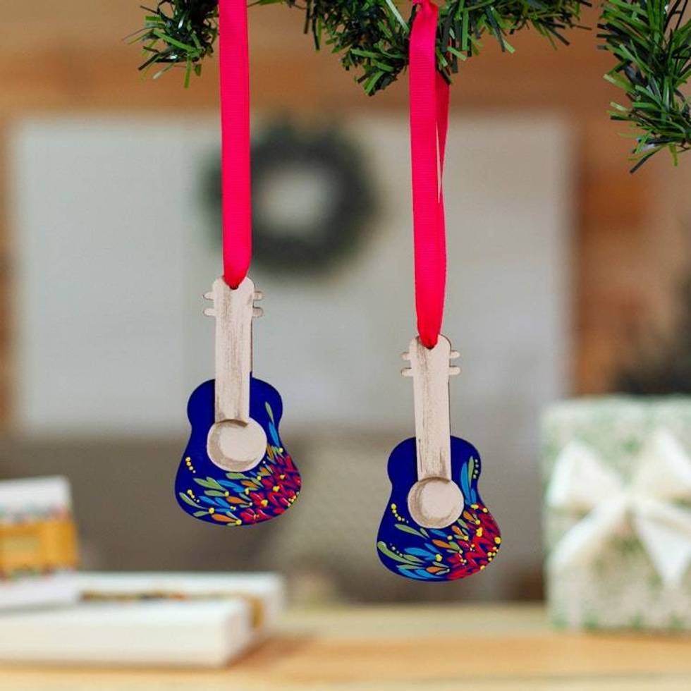 Music-Themed Pair of Hand-Painted Blue Wood Guitar Ornaments 'Little Tunes' Item ID: 2676646842