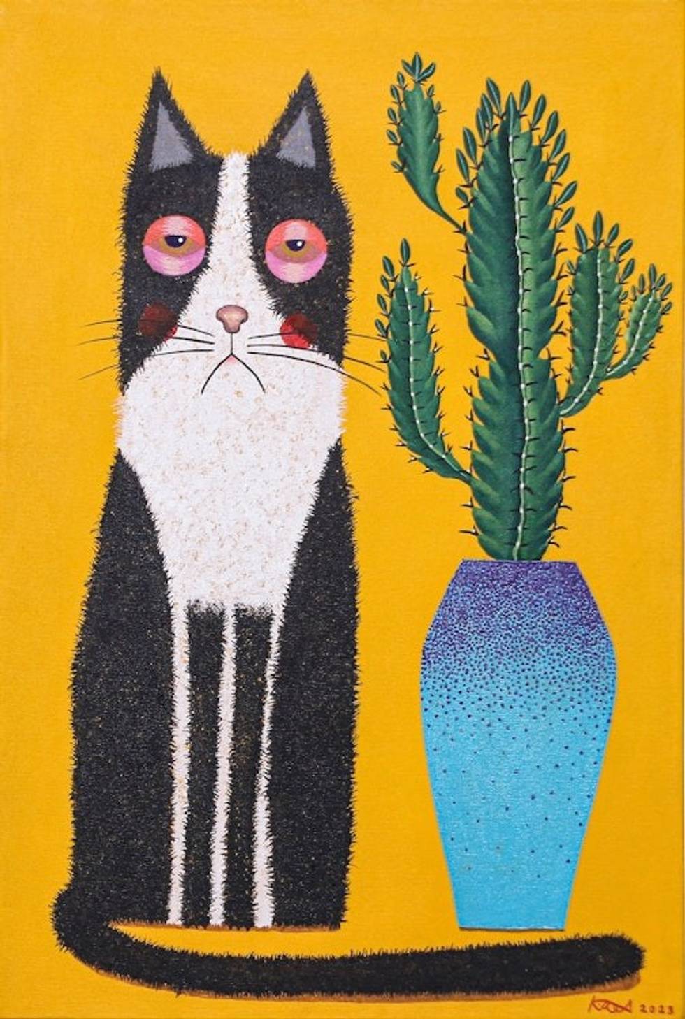 Naif Painting of Cat and Cactus with Yellow Background 'Bored Cat and Cactus' Item ID: 2669889118