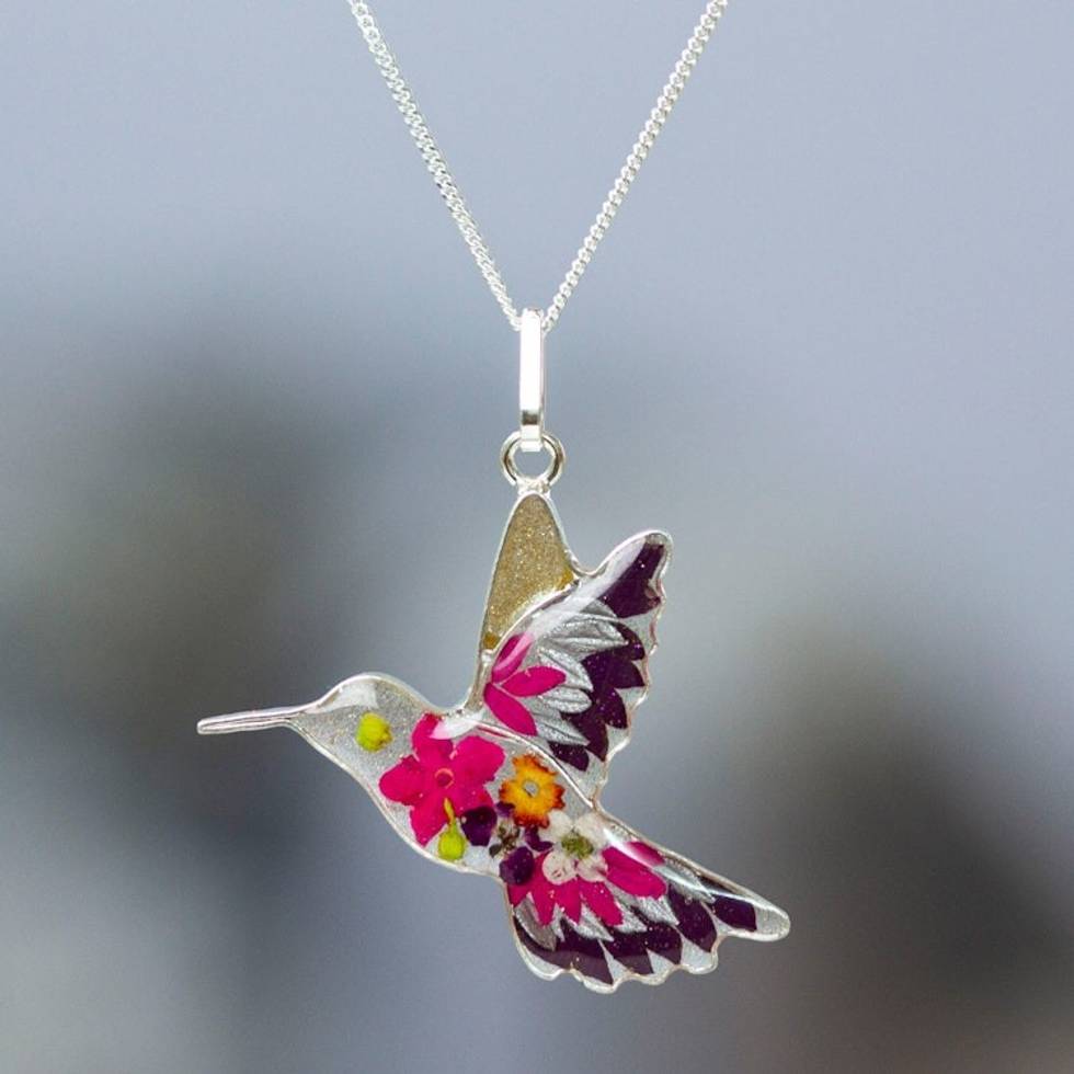 Natural Flower in Resin Silver Hummingbird Pendant Necklace 'Purple Hummingbird' Item ID: 2671798456