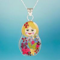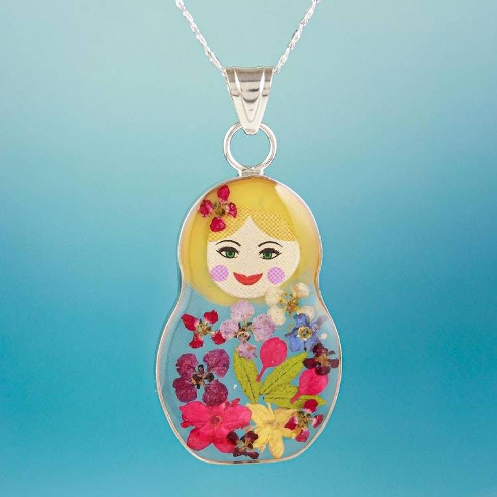 Natural Flower Pendant Necklace with Blonde Matryoshka 'Blonde Mexican Matryoshka' Item ID: 2676647069