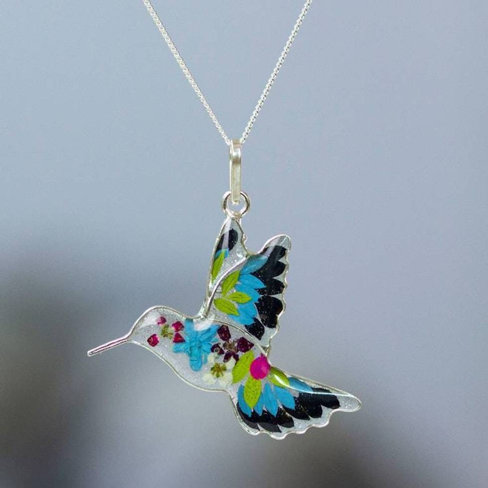 Natural Flower Resin Blue Hummingbird Pendant Necklace 'Blue Hummingbird' Item ID: 2676646917