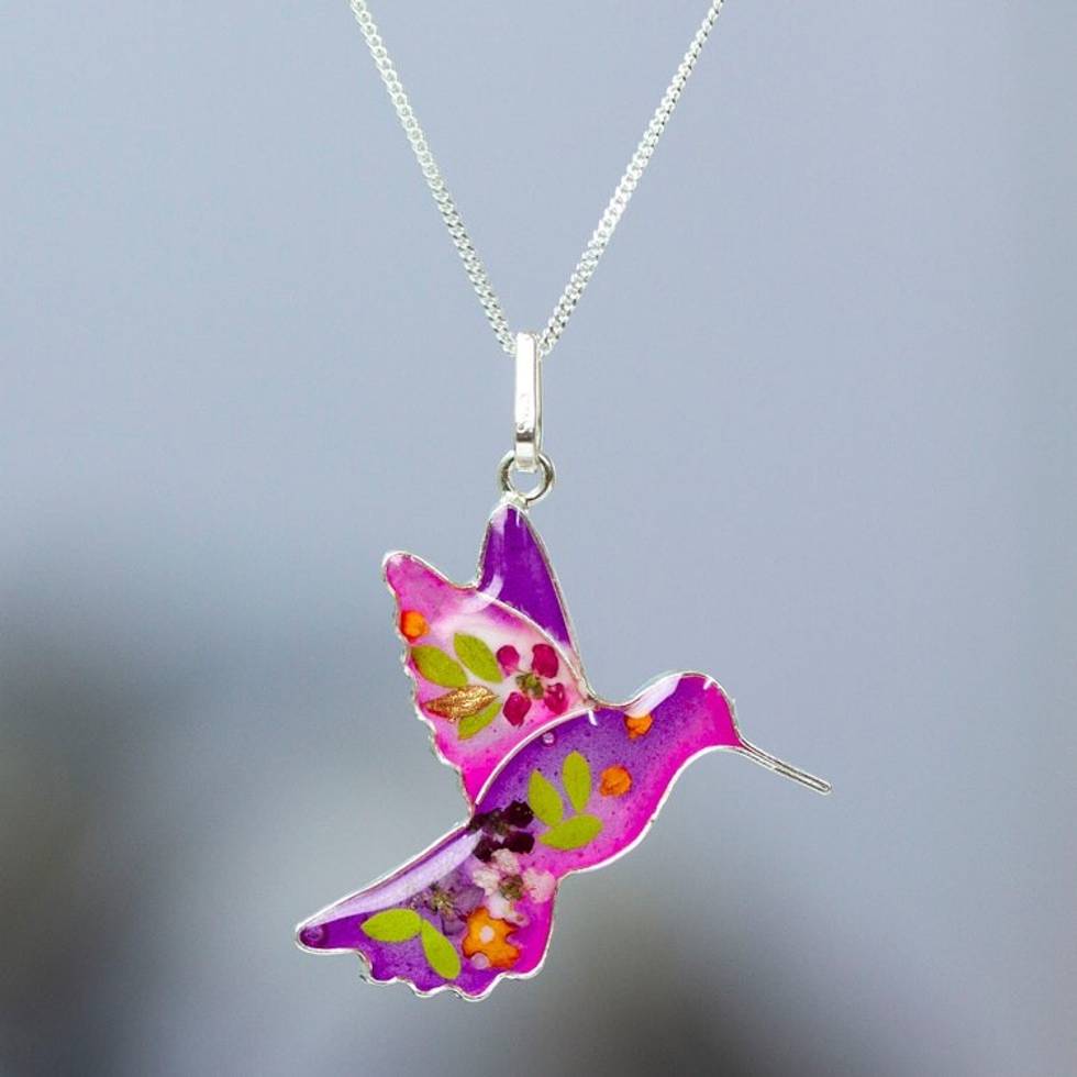 Natural Flower Resin Silver Hummingbird Pendant Necklace 'Pink Hummingbird' Item ID: 2671798724