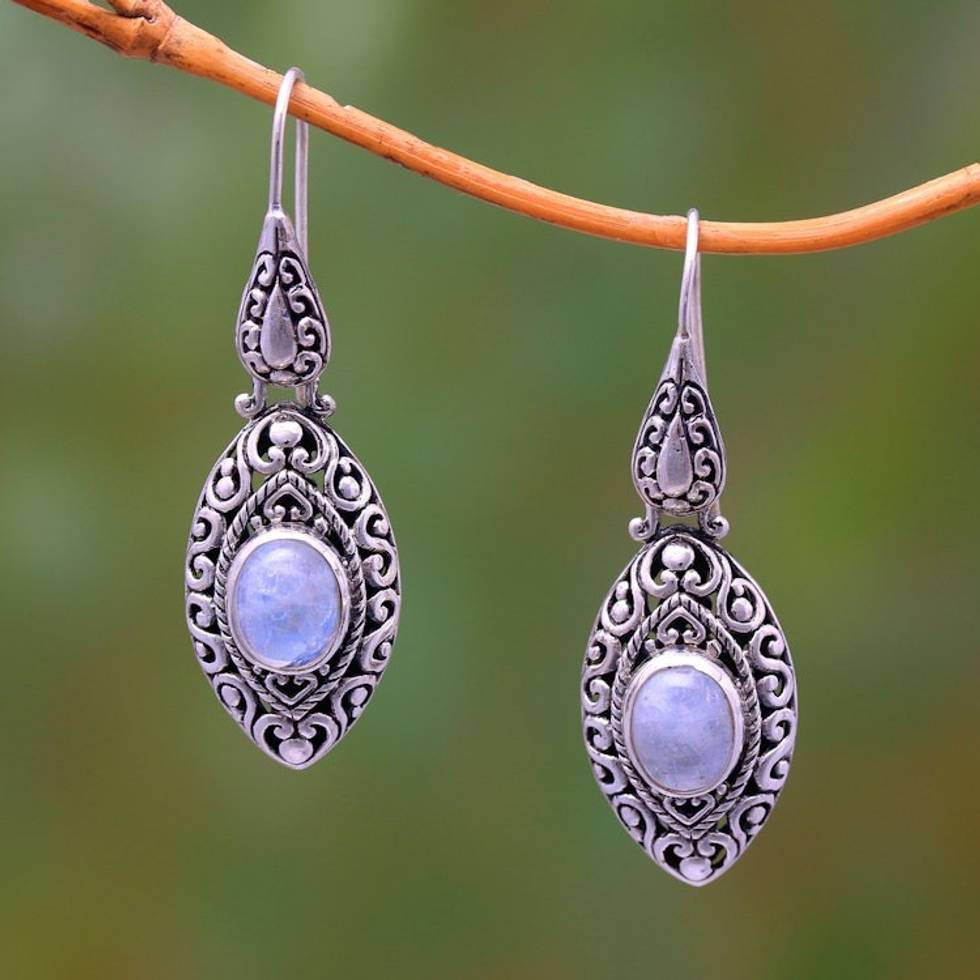 Natural Rainbow Moonstone Dangle Earrings from Bali 'Precious Canoes' Item ID: 2671736694