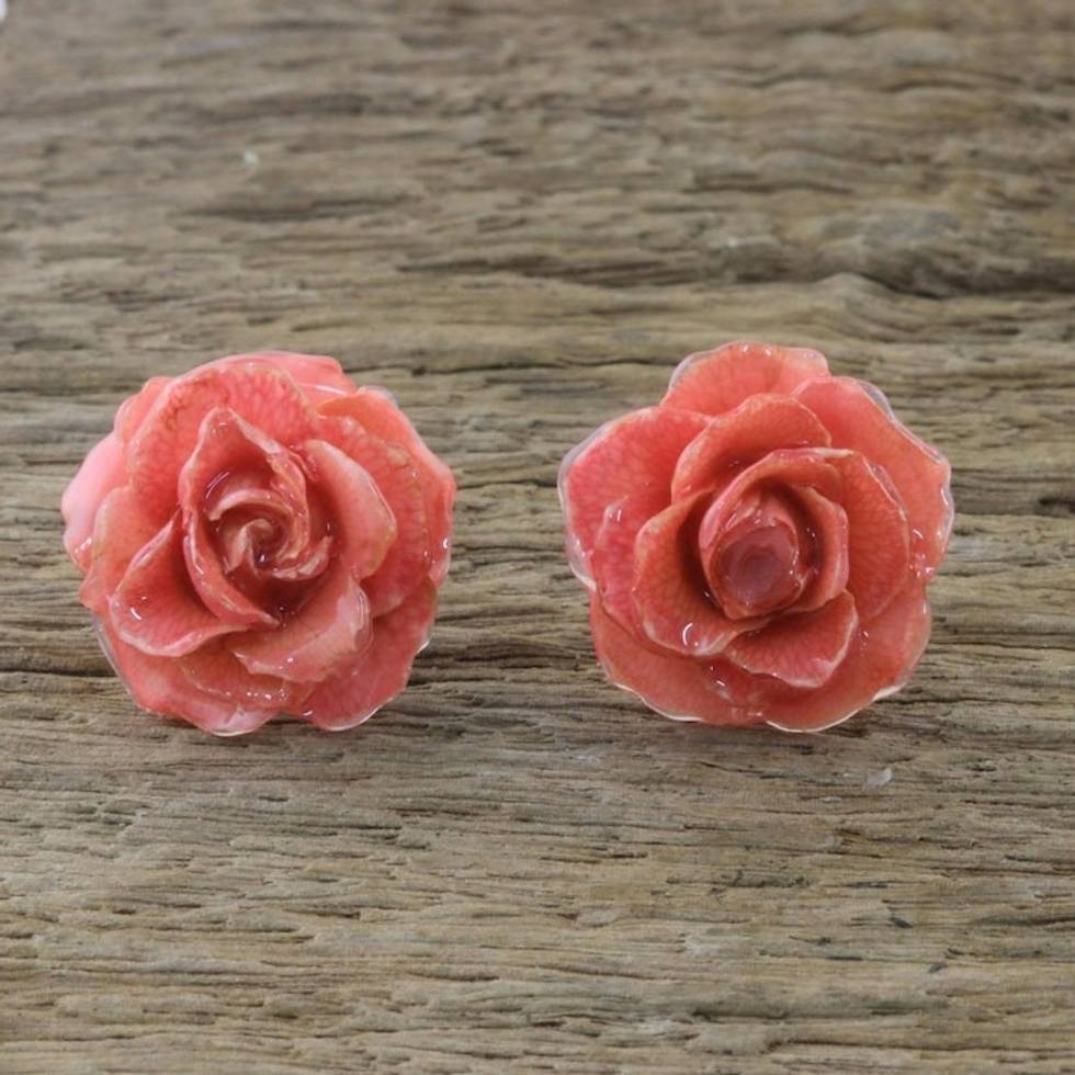 Natural Rose Button Earrings in Pink from Thailand 'Flowering Passion in Pink' Item ID: 2671801256