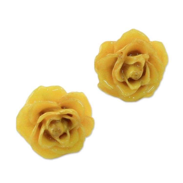 Natural Rose Button Earrings in Yellow from Thailand 'Flowering Passion in Yellow' Item ID: 2671801129