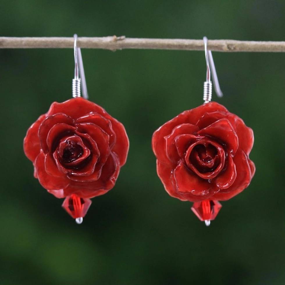Natural Rose Dangle Earrings in Red from Thailand 'Floral Temptation in Red' Item ID: 2669926599