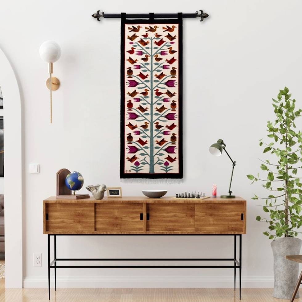 I purchased this wool birds in the sunset rug for our cabin master bedroom at Lake Tahoe. It is beautiful and well made and we just love the birds. I put it down on the floor or our master bedroom this last weekend and it just makes the whole room warmer. It would also be beautiful hung on the wall. The rug just sparkles.