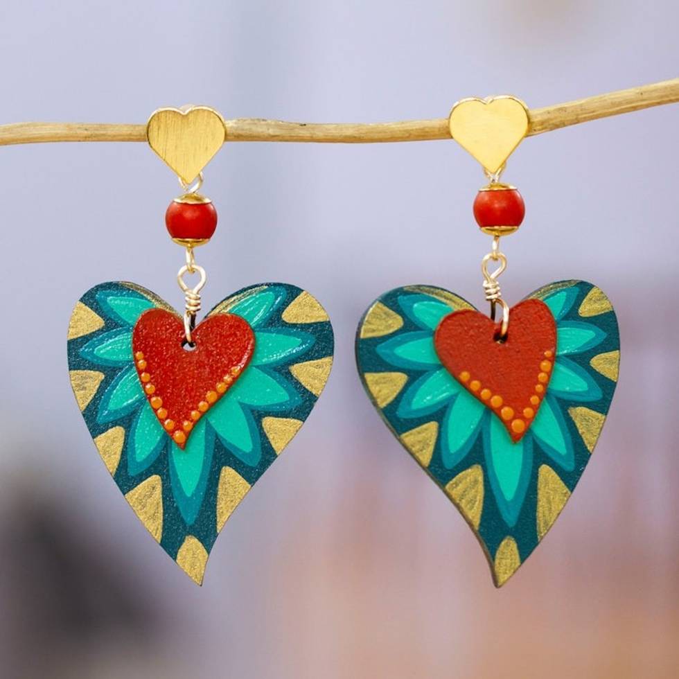 Nature-Inspired Hand-Painted Agate Heart Dangle Earrings 'Jungle Heart' Item ID: 2671639602