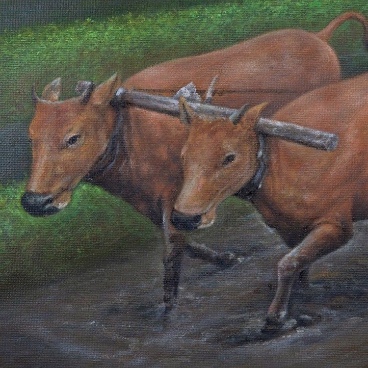 "Rich and nurturing, the Balinese lands grow with prosperous vitality each year, providing food for each habitant of this blessed region. Artist Odong Junaidi works with acrylic to create this impressionist depiction of Bali's natural wealth, portraying a farmer plowing the rice fields alongside his always loyal oxen and the sweet presence of his child.