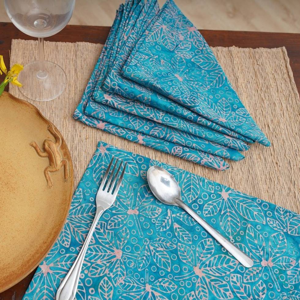 Nature-Inspired Leafy 6-Piece Turquoise Batik Napkin Set 'Turquoise Banquet' Item ID: 2671585016