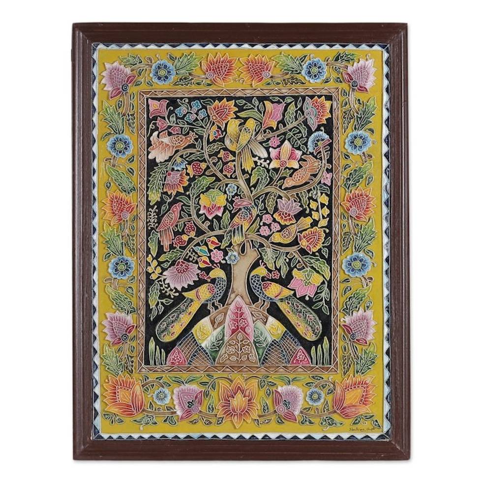 "A portrayal of nature's harmonious perfection arrives from distant Indian lands. Crafted with meticulous artistry and love for symbolism, Neelima Gupta's relief wall art depicts the beauty of every living being in this sublime piece made from marble dust and oil dyes. Yellow, black and green hues merge in every bird, leaf and flower, honoring the region's royal arts.