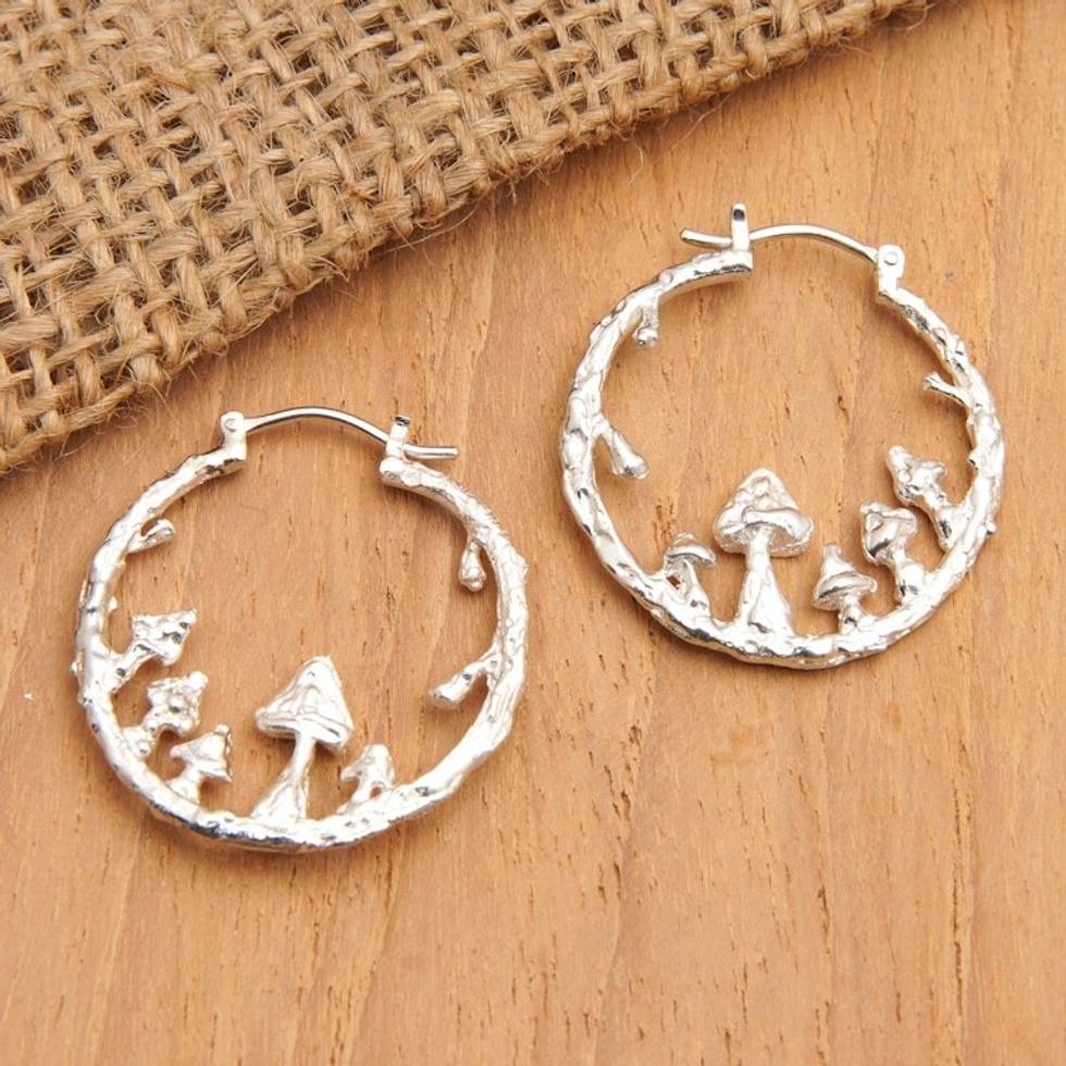 Nature-Themed Round Sterling Silver Hoop Earrings 'Mushroom World' Item ID: 2671821038