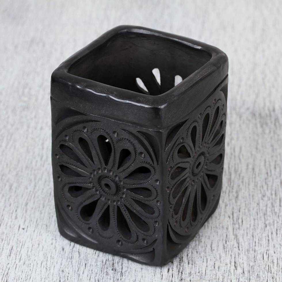 Oaxaca Barro Negro Rectangular Floral Ceramic Pencil Holder 'Oaxacan Flower' Item ID: 2669897383