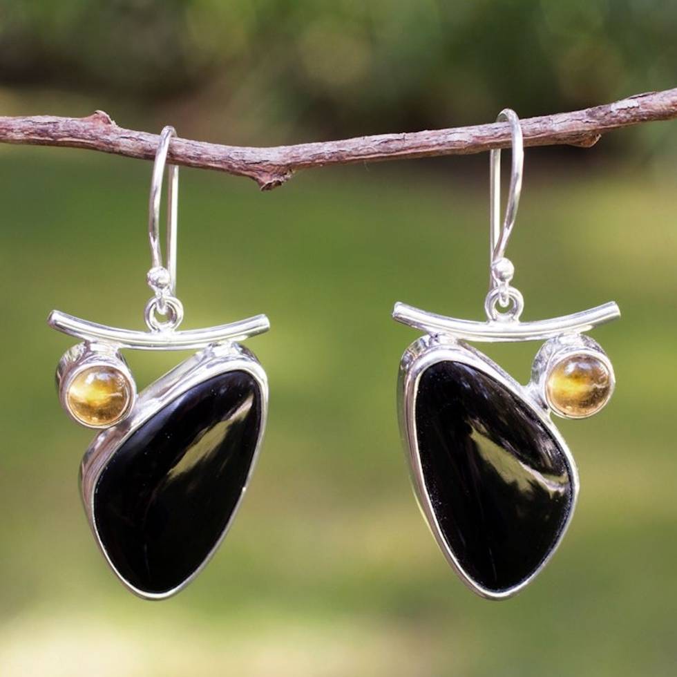 The black of the obsidian and yellow of the citrine really "pop" in these earrings. They are such a unique design and they feel good in my ears and look lovely (better than the photos). I was looking for a pair of Taxco earrings to match an onyx sterling silver bracelet and pendant and these are perfect.