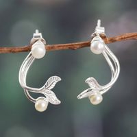 Ocean-Themed Sterling Silver and Cream Pearl Drop Earrings 'Pearly Fins' Item ID: 2671782198