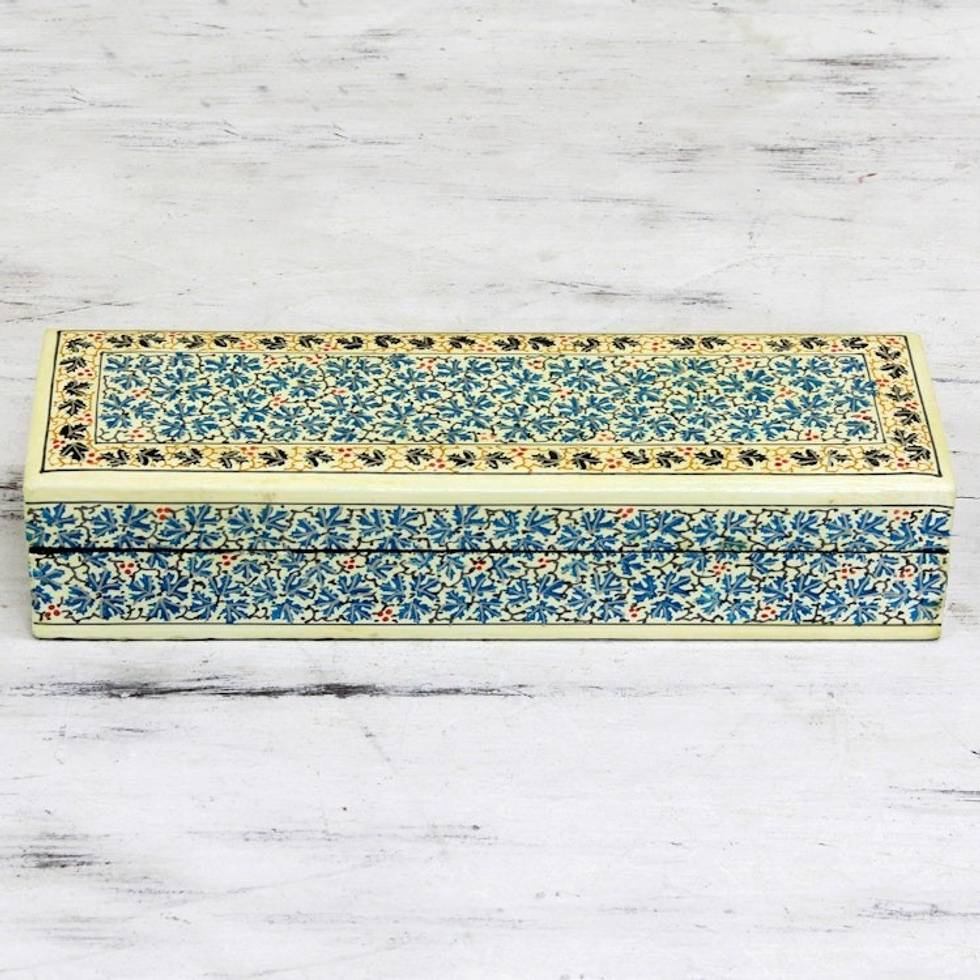 Thank you Sajad for your beautiful artistry. I purchased this chinar wood box to hold my special pens on my desk. The colors are so light and fresh?cream color, bright green, tangerine and gold. It makes me happy every time I see it. I will definitely purchase again from this artist!