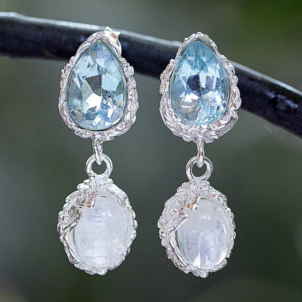 One-Carat Blue Topaz and Rainbow Moonstone Dangle Earrings 'Celestial Dream' Item ID: 2671765235