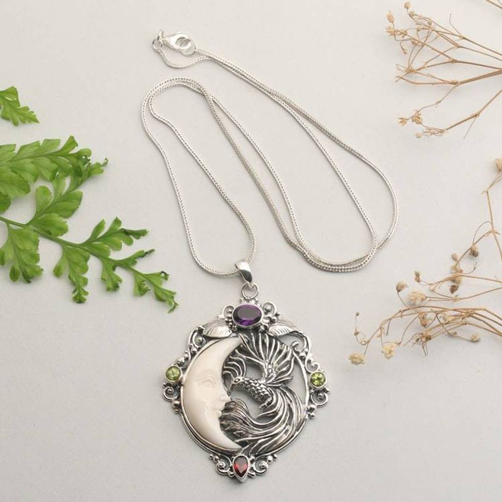 The craftsmanship is amazing, the size of the pendant is perfect! I love the detail in the moon and beautiful garnet and amethysts! Absolutely love this!