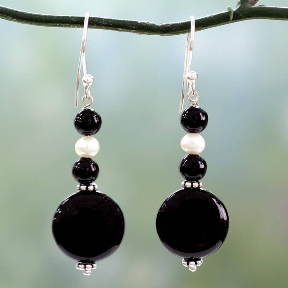 Onyx and pearl dangle earrings 'Midnight Kisses' Item ID: 2669943523