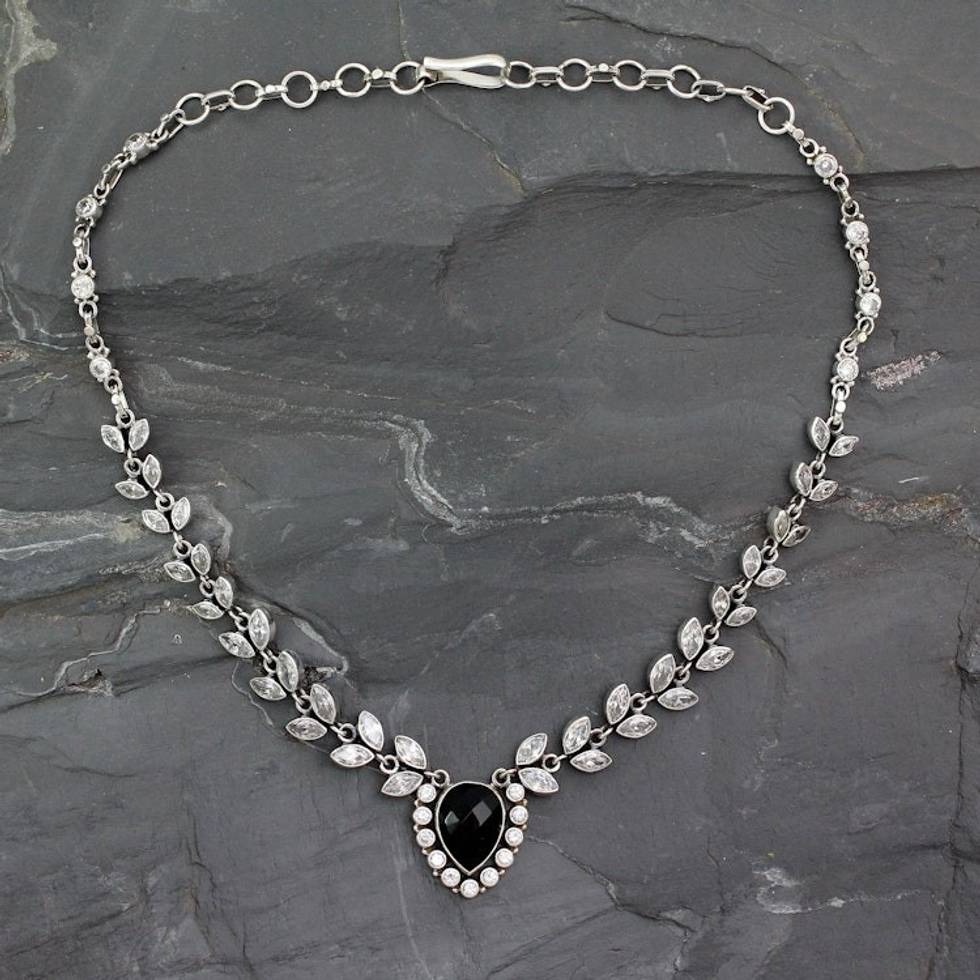 Onyx and Quartz Y Necklace in Sterling Silver 'Midnight Dewdrops' Item ID: 2669925376