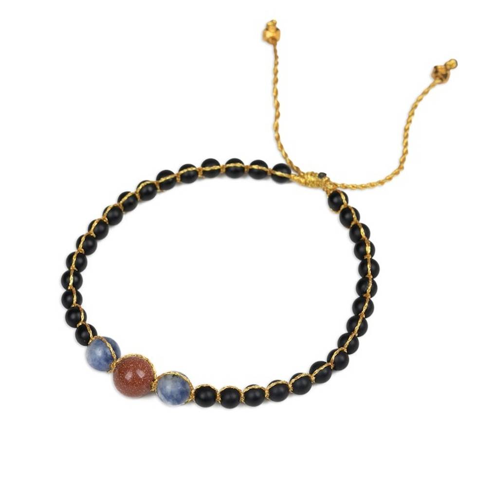 "Align your mind with the onyx's energies of mystery and power. Bali's Made Masna complements the jewels' dapper colors with two sodalite gems-symbols of truth-and a centered sandstone. A golden polyester cord joins each element while adding a sliding knot, adorned with 18k gold-plated brass beads."