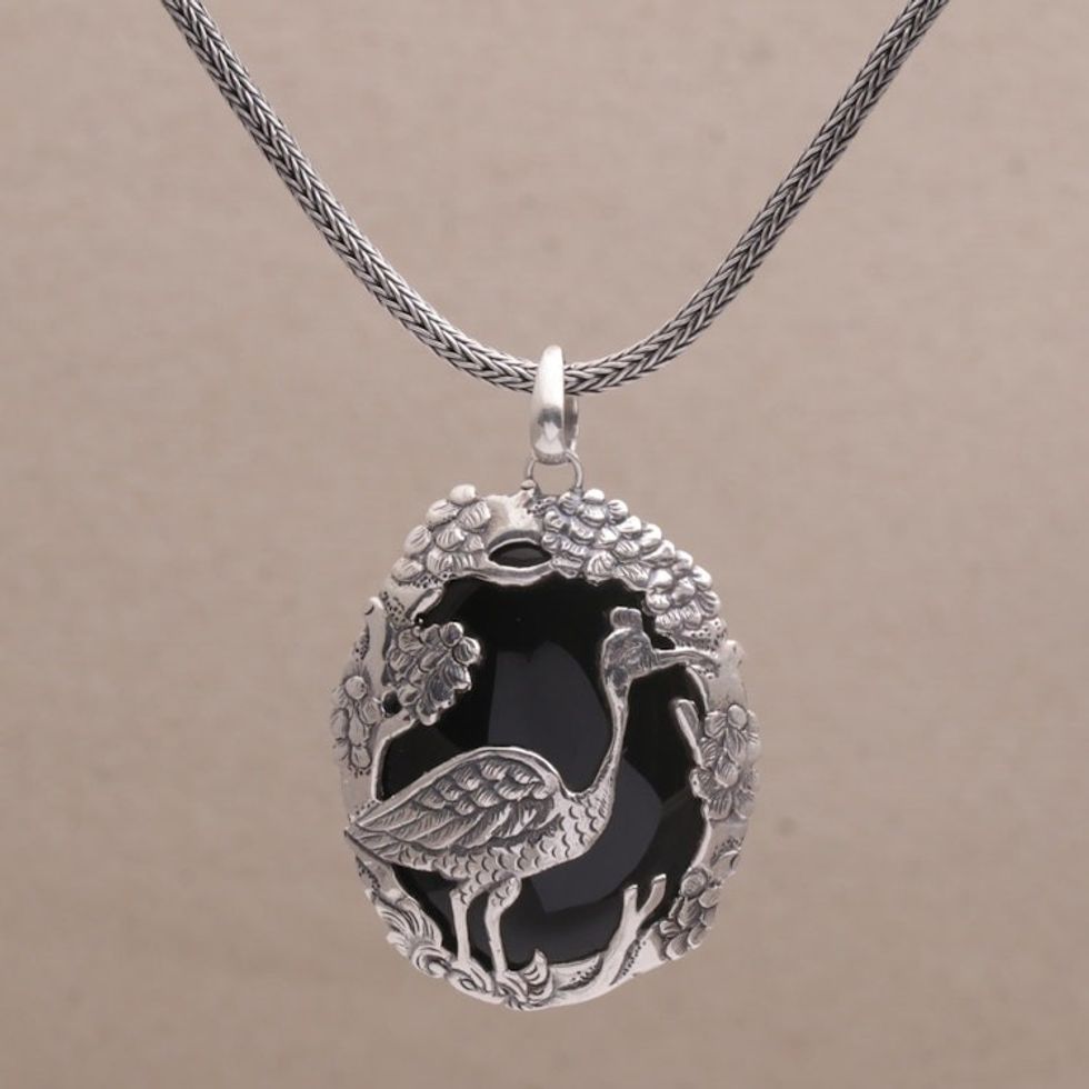 Onyx and Sterling Silver Bird-Themed Necklace from Bali 'Mother Heron' Item ID: 2671734994