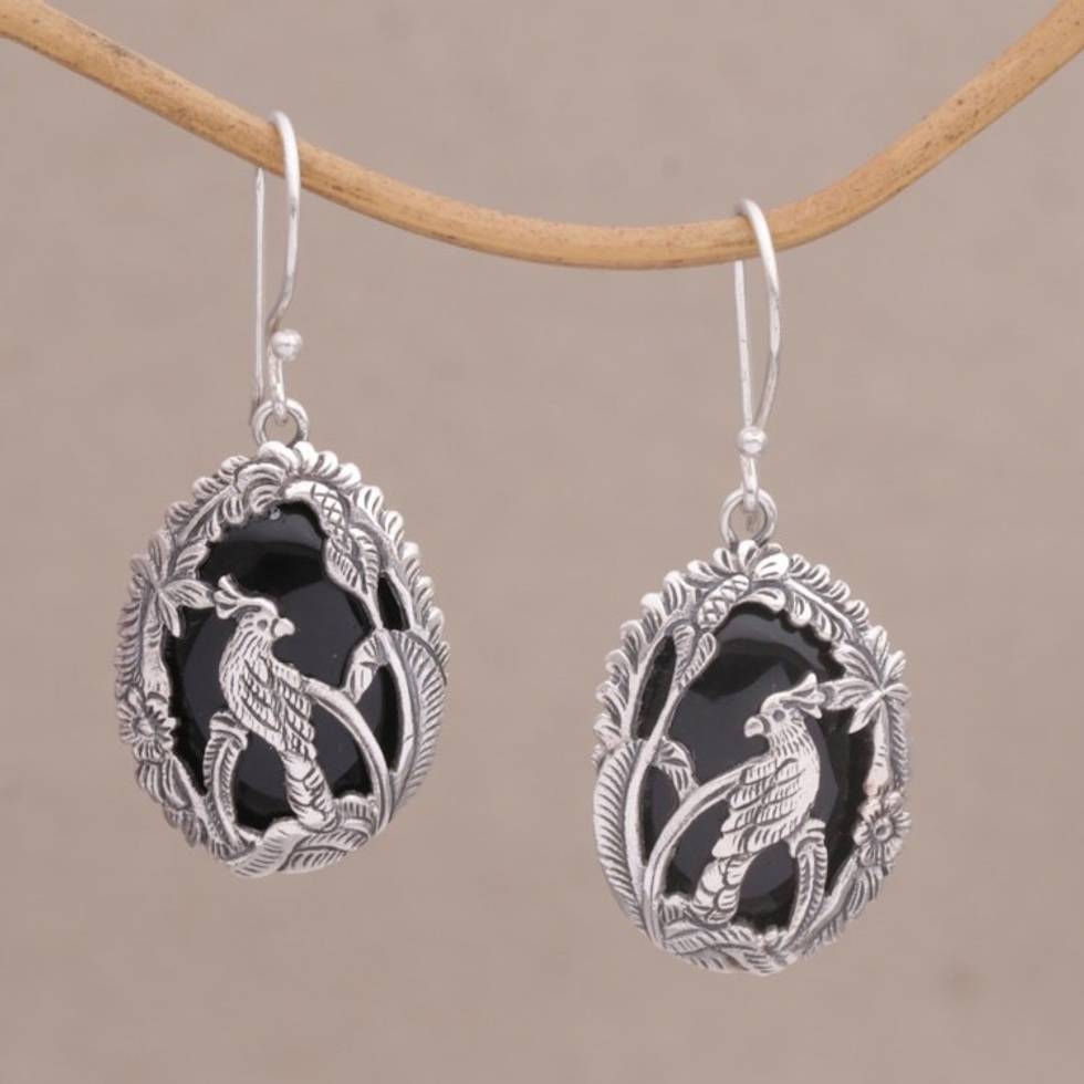 Onyx and Sterling Silver Cockatoo Dangle Earrings from Bali 'Cockatoo Garden' Item ID: 2671735093
