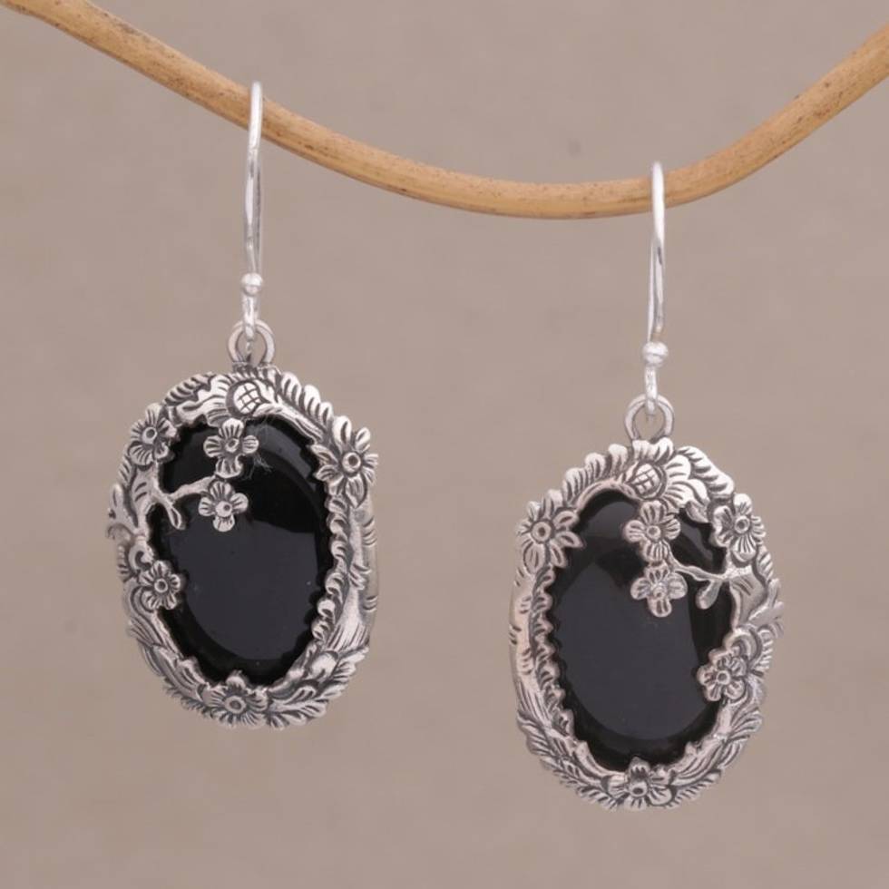 Onyx and Sterling Silver Floral Dangle Earrings from Bali 'Dreamy Forest' Item ID: 2670222037