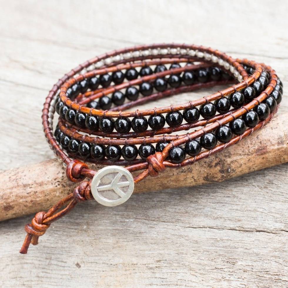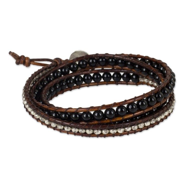 Onyx Beads on Brown Leather Wrap Bracelet from Thailand 'Hill Tribe Boheme' Item ID: 2671801823