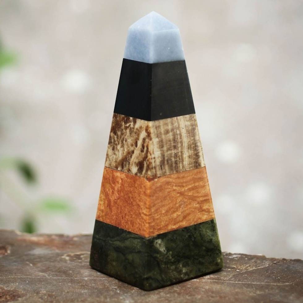 When I spotted this combination I didn't hesitate buying one. I am gemstone collector and love learning about the mystical healing powers of gemstones like, Celestite, Onyx, Aragonite, Jasper and Serpentine, just to name a few. I just received it over the weekend and I know; as soon as my granddaughters spot it I will have a hard time keeping them from constantly picking it up. I will be buying more gemstone sculptures like this obelisk. Thank you Cesar Gonzales for creating beautiful pieces of art from mother natures beautiful creations.