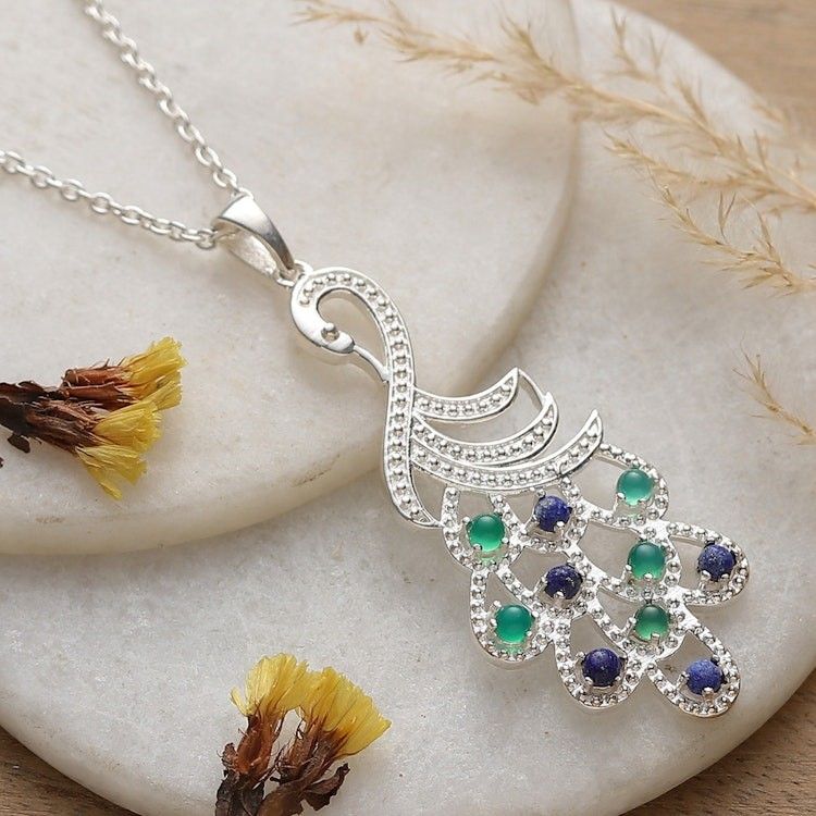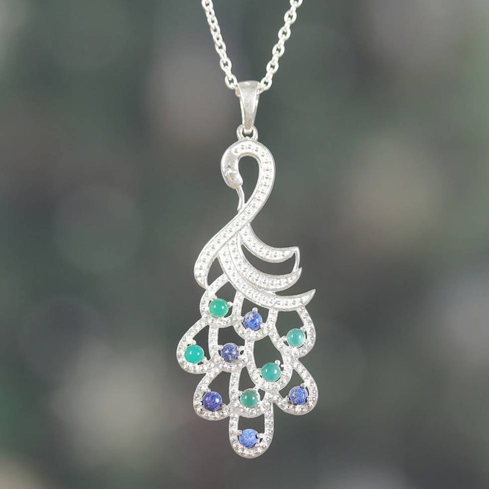 Onyx Lapis Lazuli Sterling Silver Peacock Pendant Necklace 'Sublime Peacock' Item ID: 2671781996