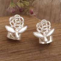 Openwork Sterling Silver Rose Leaf Stud Earrings from Bali 'Baby Rose' Item ID: 2671764247