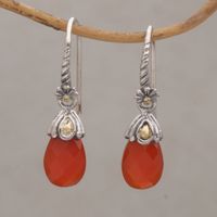 "With a long-held passion for jewelry, Balinese designer Lenny enjoys working with opulent gemstones. The skill she has for creating eye-catching pieces shines with her choice of six carats of faceted orange chalcedony briolettes that sparkle brilliantly in this pair of dangle earrings. Each stunning earring is crowned with petals of sterling silver and a dainty flower, which are adorned with petite 18k gold accents."