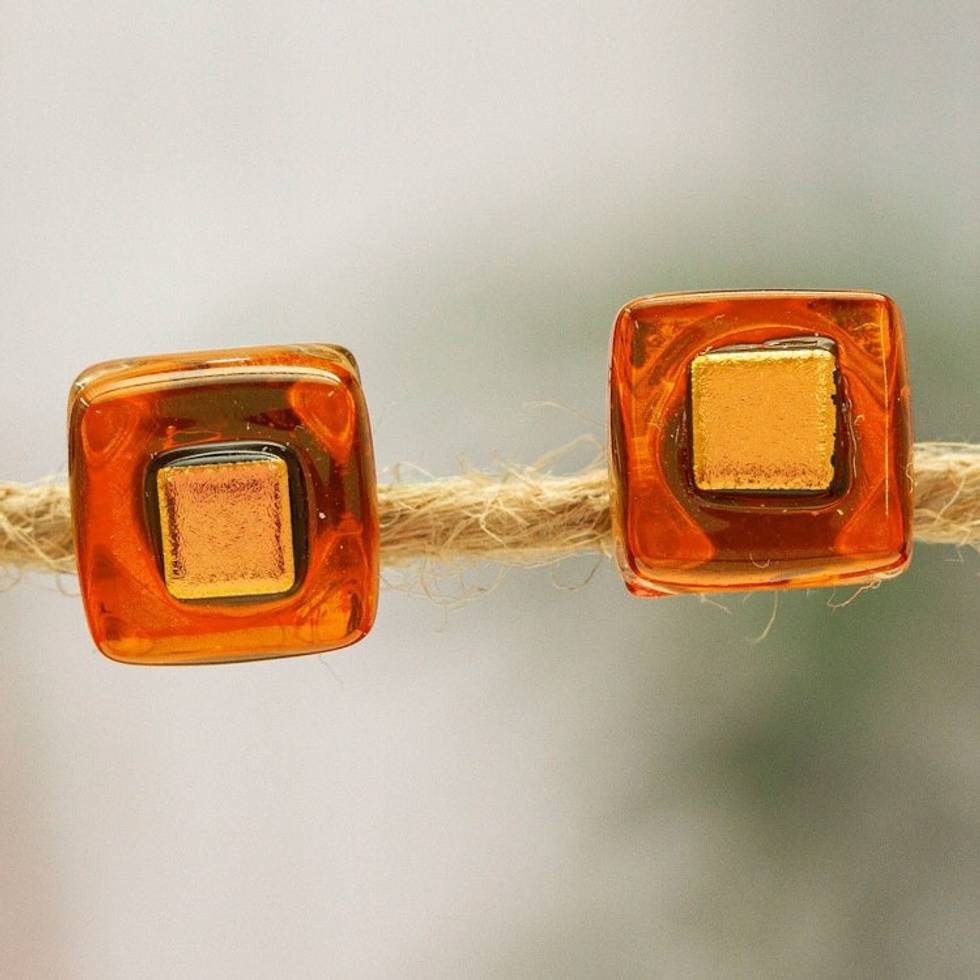 Orange Fused Glass Mosaic Stud Earrings Handmade in Mexico 'Orange Dichroic' Item ID: 2669931890