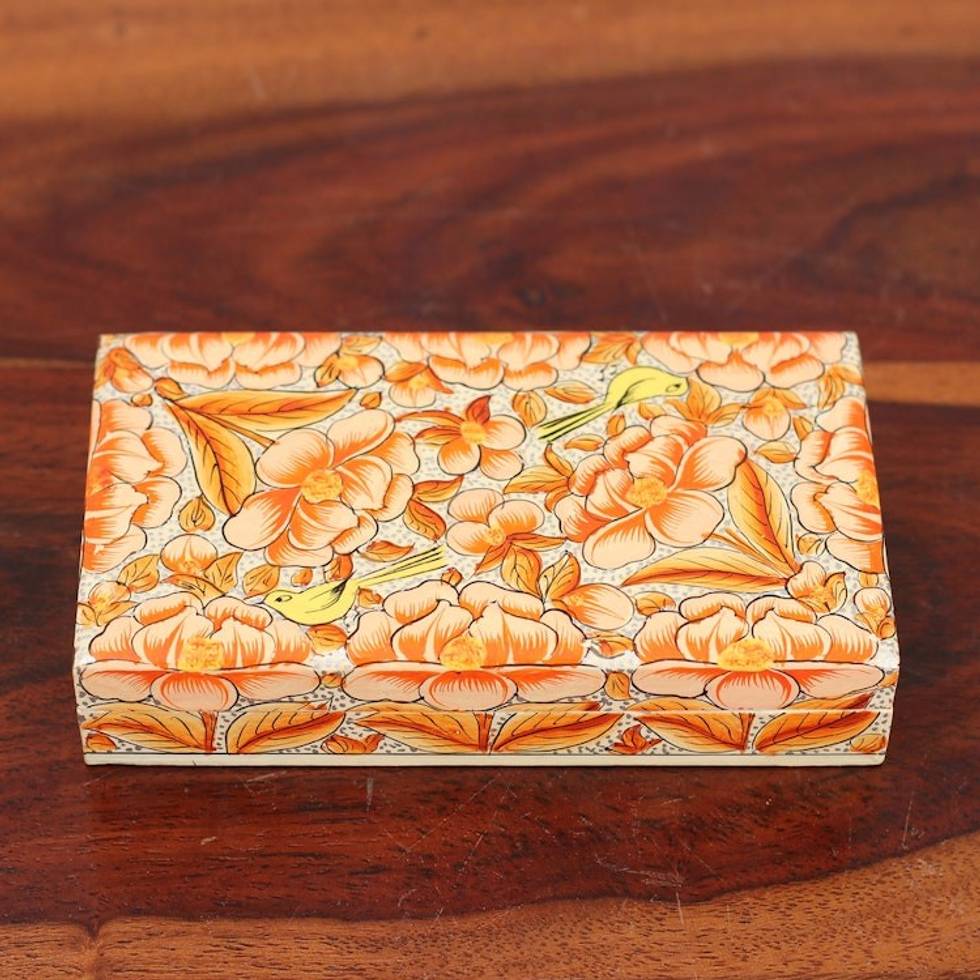 Orange Papier Mache on Wood Floral Leaf Bird Decorative Box 'Blooming Kashmir in Orange' Item ID: 2671781912