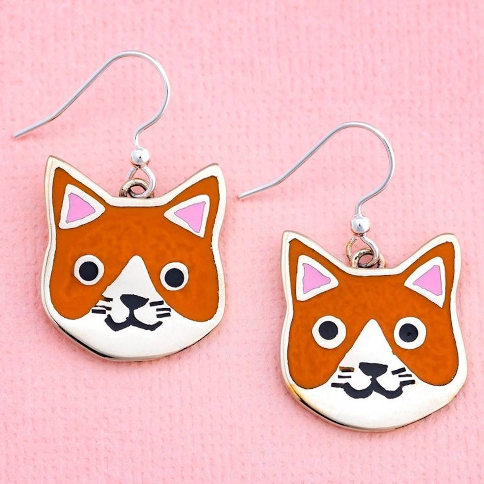 "As the funniest felines in the world, these orange cats have the mission to add a lighthearted attitude to your days. A combination of Alpaca silver and brass allows these dangle earrings to shine radiantly, while resin accents paint the kitties with their characteristic orange hue."